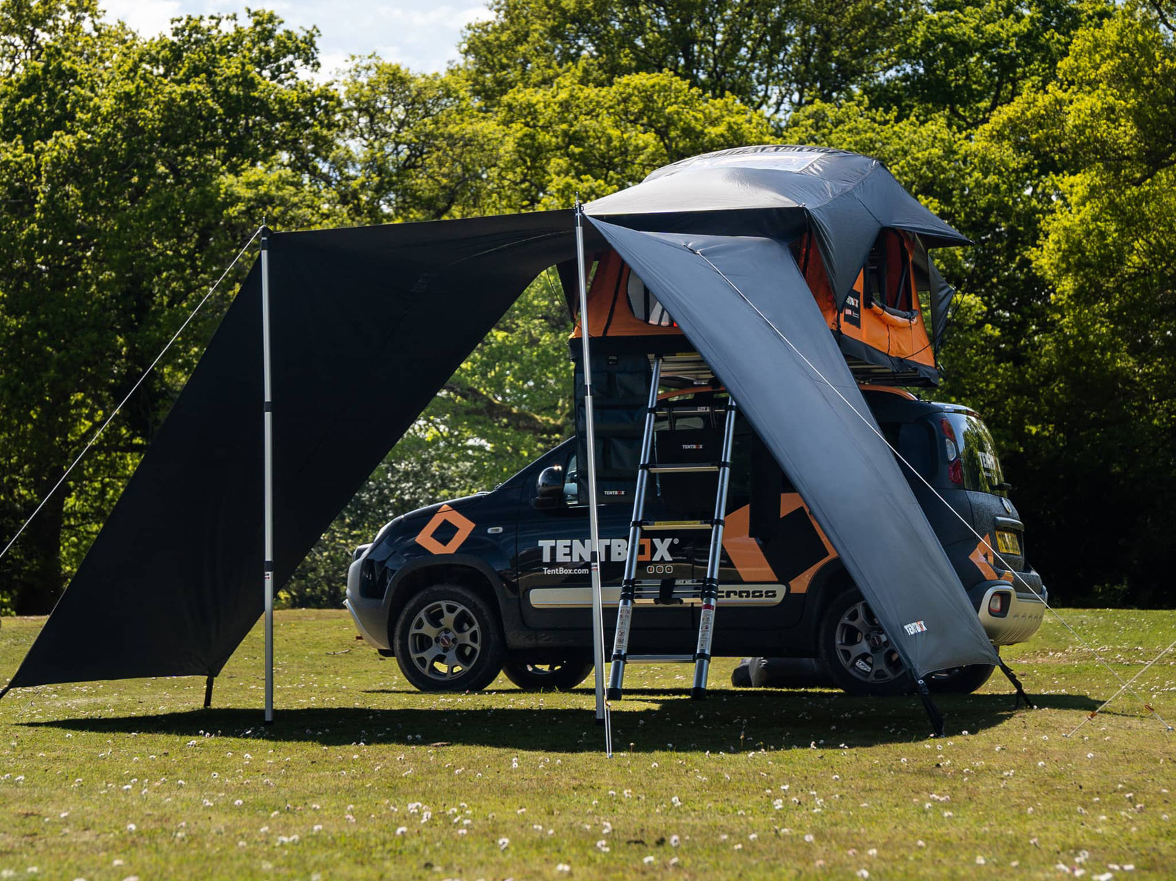 Die Tunnelmarkise lässt sich in nur wenigen Minuten nahtlos mit deiner TentBox Lite 2.0 verbinden und deckt sogar die Leiter ab. So entsteht der ultimative Wohnbereich, der dich vor allen Witterungsbedingungen schützt.
