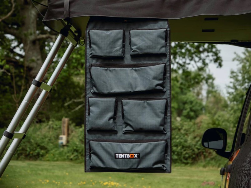 Die ideale Lösung für die Aufbewahrung kleinerer Ausrüstungsgegenstände: Mit dieser praktischen Tasche bleibt alles ordentlich aufgerollt und gut verstaut. Im ausgerollten Zustand kannst du sie bequem überall aufhängen – zum Beispiel an deiner Leiter oder an den Dachträgern deiner TentBox.